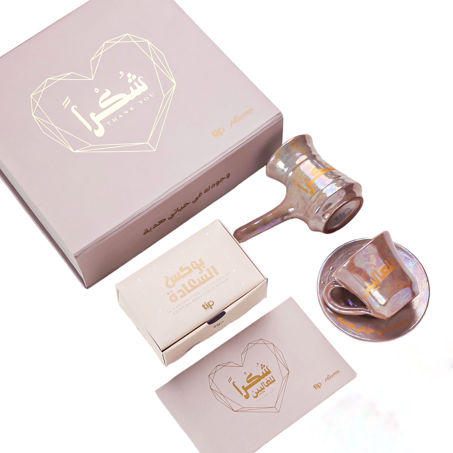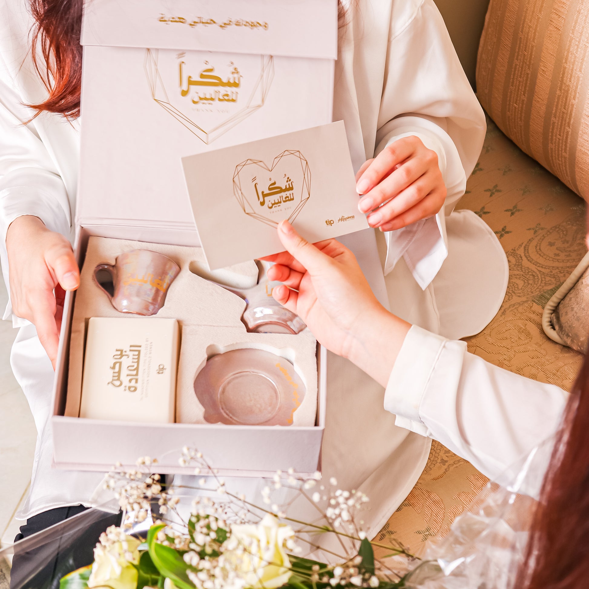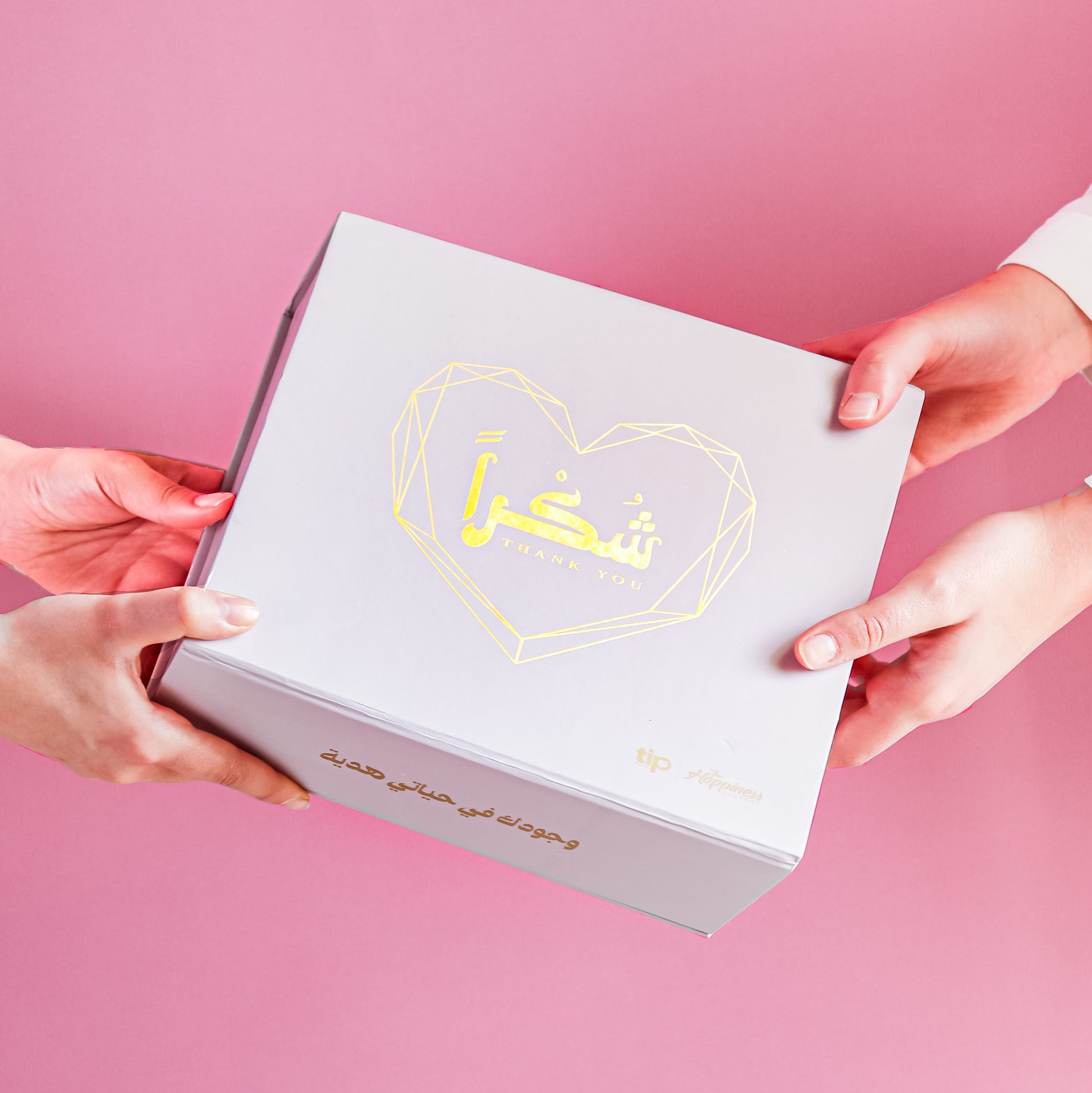 – علبة قيمة لحفظ المنتج وتقديمه كهدية، مكتوب عليها من الأعلى “شكراً” ومن الجانب “وجودك في حياتي هدية”